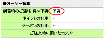 オーダー画面にて、右記のように「到着時のご連絡 要or不要」欄で、『要』とされているオーダーについては、JISAに商品が到着しましたらメールでご連絡差し上げます。