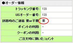 オーダー画面にて、右記のように「到着時のご連絡 要or不要」欄で、『不要』とされているオーダーについては、JISAに商品到着後、速やかに日本へ発送手配致しますので、発送依頼のお手続きは必要ありません。 |