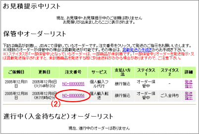 (1) 発送依頼のお手続きは、会員ページ左メニューの、保管中オーダーリストをクリックして下さい。