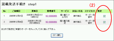 (2) まとめて発送したいオーダーにチェックを入れ、「次へ進む」をクリックして下さい。